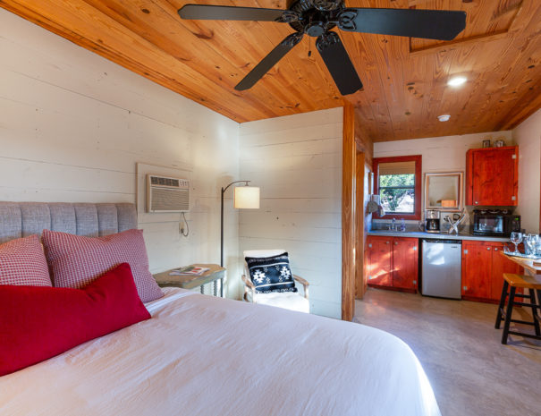 - Amenities: In-Room Bath & Shower, Laptop-friendly Workspace, Heating & AC, Kitchenette, Refrigerator, Microwave, Coffee Maker, Wi-Fi, Easy Chair, Ceiling Fan, Towels, Bed Sheets, Toilet Paper, Shaded Porch & Bench, Smoke Detectors, BBQ Grill, Fire Extinguisher, Smart TV
